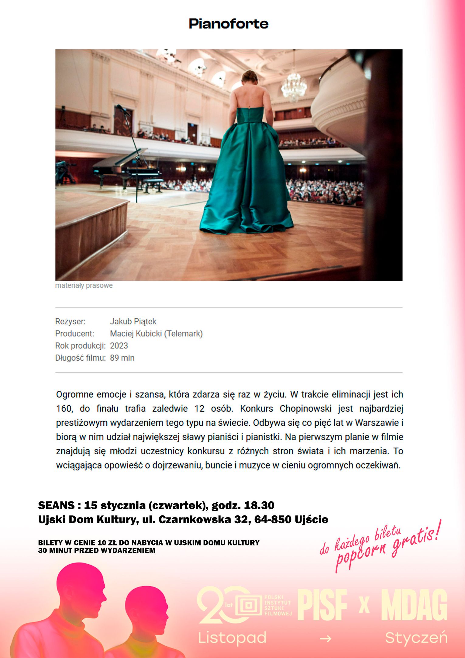 Już 15 stycznia (czwartek), godz. 18.30: „PIANOFORTE”. Ogromne emocje i szansa, która zdarza się raz w życiu. W trakcie eliminacji jest ich 160, do finału trafia zaledwie 12 osób. Konkurs Chopinowski jest najbardziej prestiżowym wydarzeniem tego typu na świecie. Odbywa się co pięć lat w Warszawie i biorą w nim udział największej sławy pianiści i pianistki. Na pierwszym planie w filmie znajdują się młodzi uczestnicy konkursu z różnych stron świata i ich marzenia. To wciągająca opowieść o dojrzewaniu, buncie i muzyce w cieniu ogromnych oczekiwań.