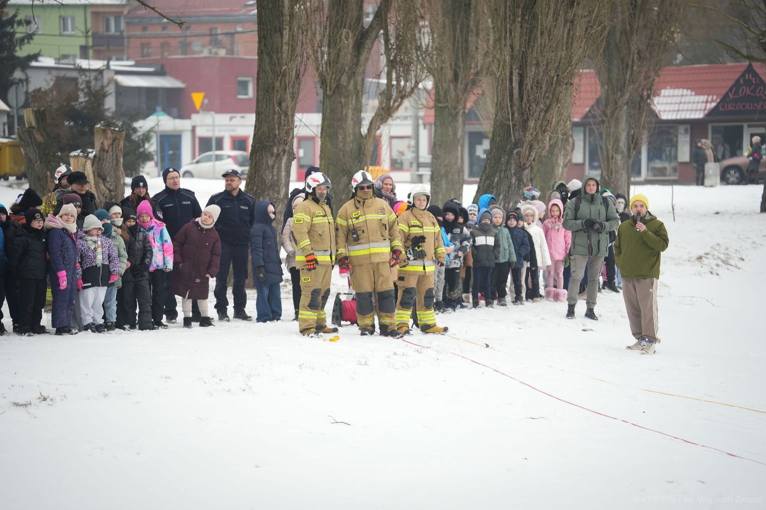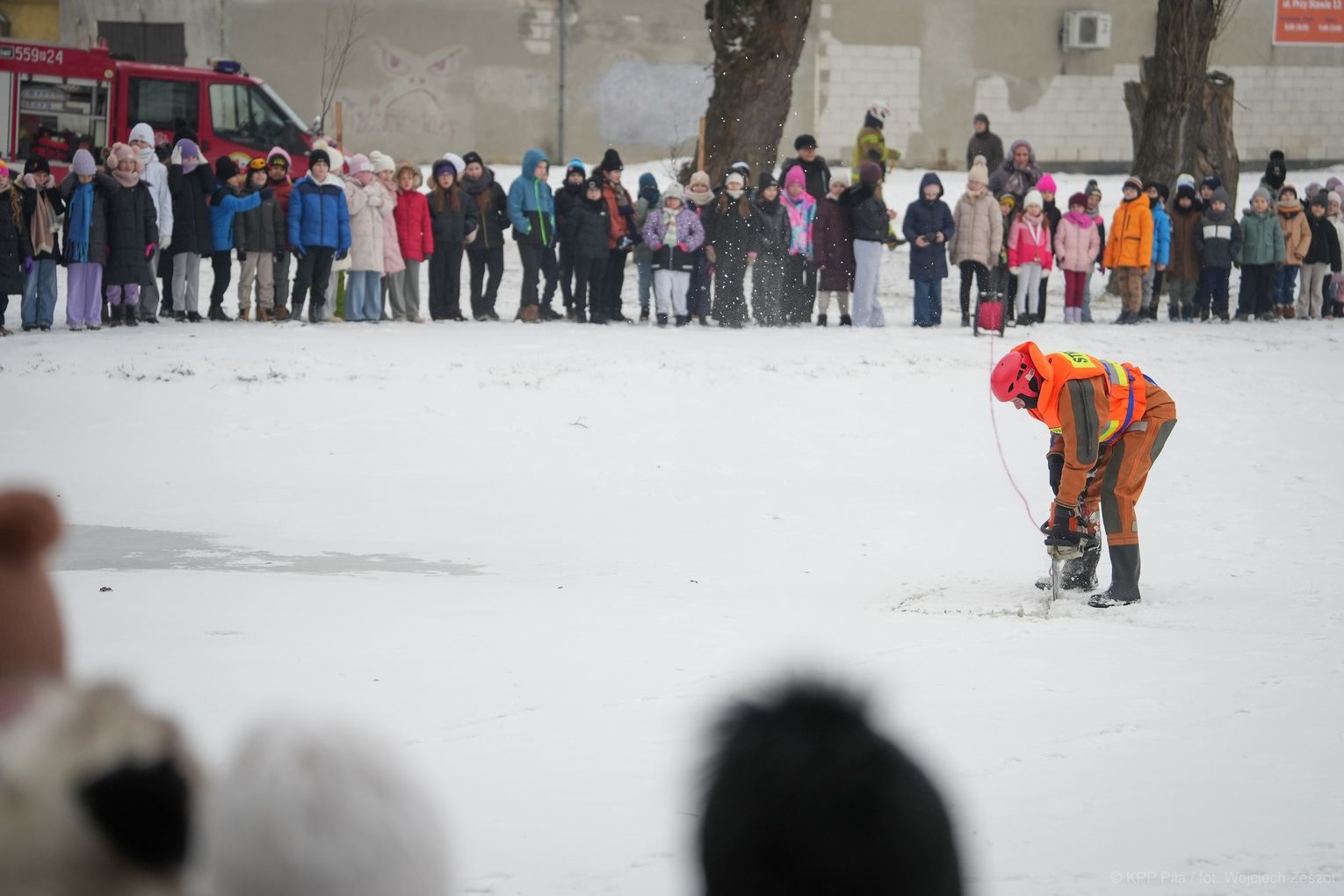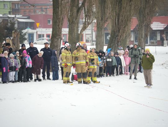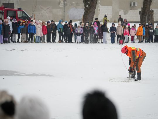 Spotkanie miało na celu promowanie bezpiecznych zachowań w okresie zimowym, szczególnie w kontekście zbliżających się ferii. Najmłodsi uczestnicy mogli zobaczyć pokaz działań ratowniczych prowadzonych na zamarzniętym akwenie. Strażacy zaprezentowali, jak wygląda akcja niesienia pomocy osobie, pod którą załamał się lód. Demonstracja była nie tylko widowiskową lekcją, ale przede wszystkim przestrogą przed wchodzeniem na zamarznięte zbiorniki wodne. Stanowiła także punkt wyjścia do rozmowy o zasadach udzielania pierwszej pomocy w przypadku wychłodzenia organizmu.